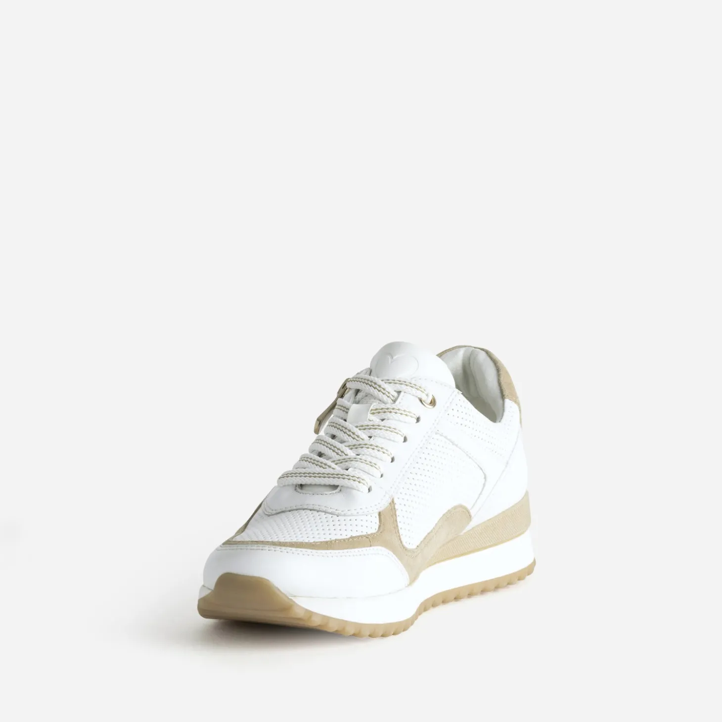 Blanc et beige côté couleurs. Cuir perforé et synthétique suédée côté matières. Cette tennis pour femme associe les contrastes, avec beaucoup de facilité. A l’intérieur, la semelle amovible permet de s’ajuster pour toujours plus de confort. Un modèle à imaginer avec une tunique en lin blanc et un pantalon chino beige, avec bords roulottés sur la cheville.