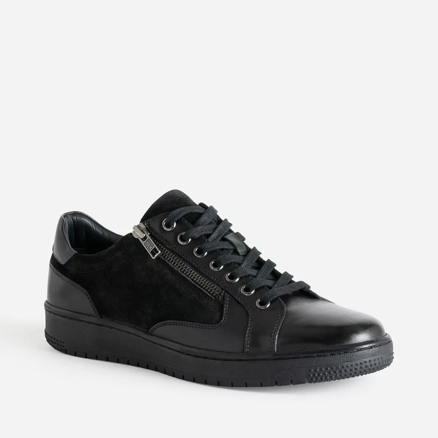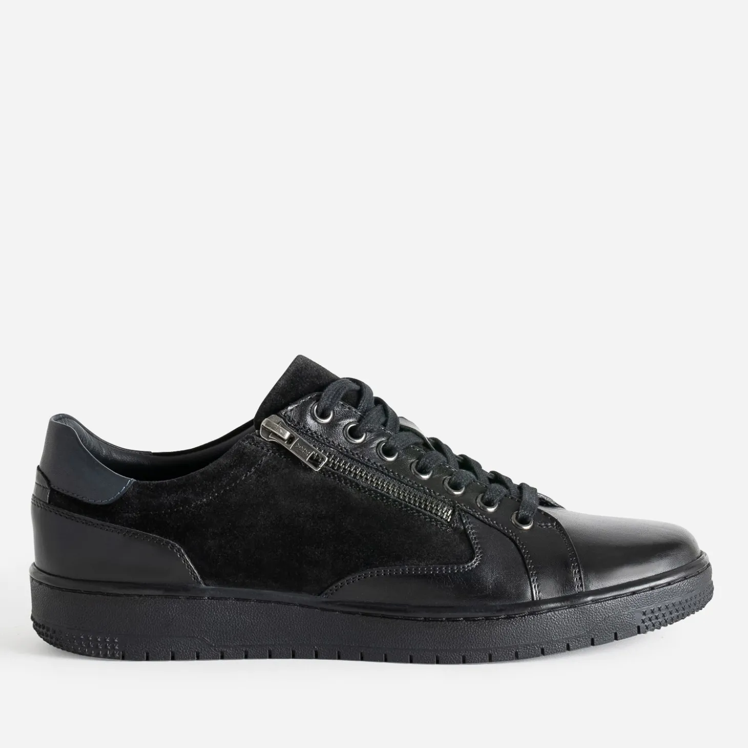Mix de cuir lisse et de cuir velours validé à l’unanimité ! Cette tennis homme joue la carte de l’élégance, dans un coloris noir, intemporel. Le lacet plat, ton sur ton, est renforcé par un zip côté. Le contrefort marine fait, lui, écho à la doublure. Un modèle à oser avec un total look noir monochrome, pull à col roulé oversize sur pantalon baggy.