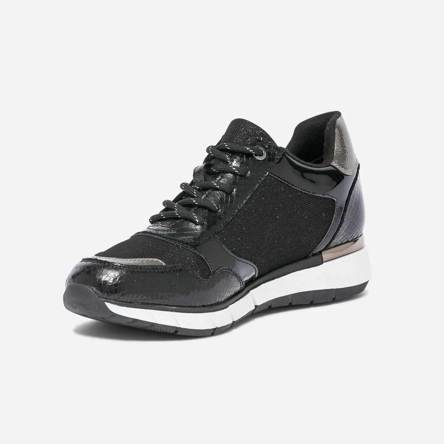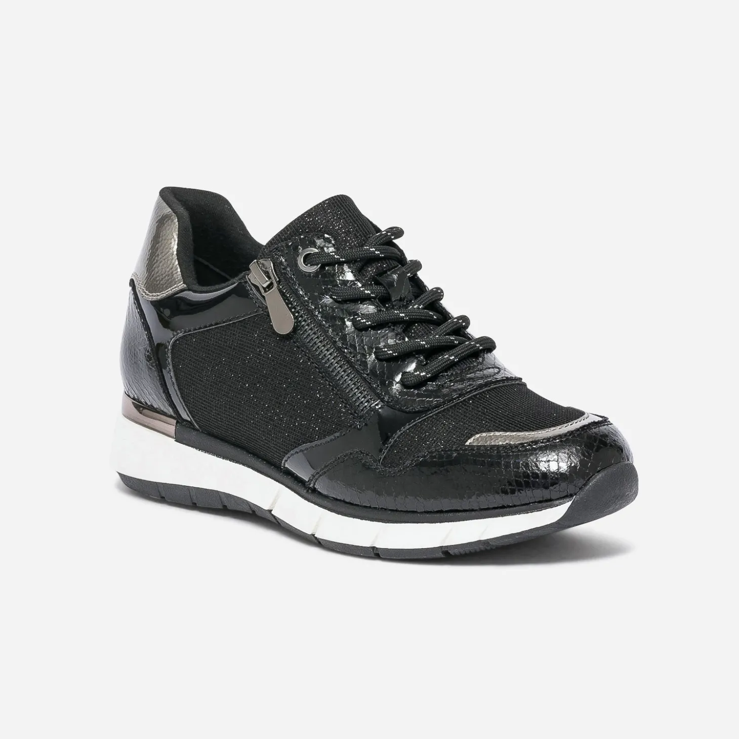 Des paillettes, du verni, du métallisé. 3 bonnes raisons de craquer pour cette tennis pour femme. Noire, elle est twistée de touches bronze sur le bout du pied et le contrefort. Un modèle casual chic, aussi à l’aise avec une tenue sport qu’avec un costume.