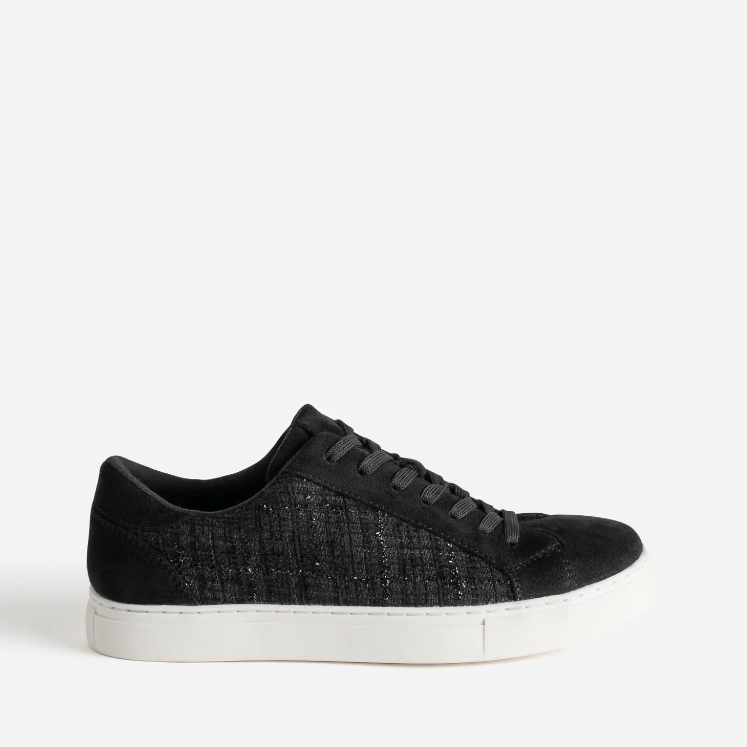 Faites entrer la tennis dans vos looks du quotidien. Noire, elle associe un textile à motif carreaux pailletés sur les côtés à une matière synthétique suédée sur le bout, la patte de laçage et le contrefort. Un modèle facile à combiner, avec un total look black.