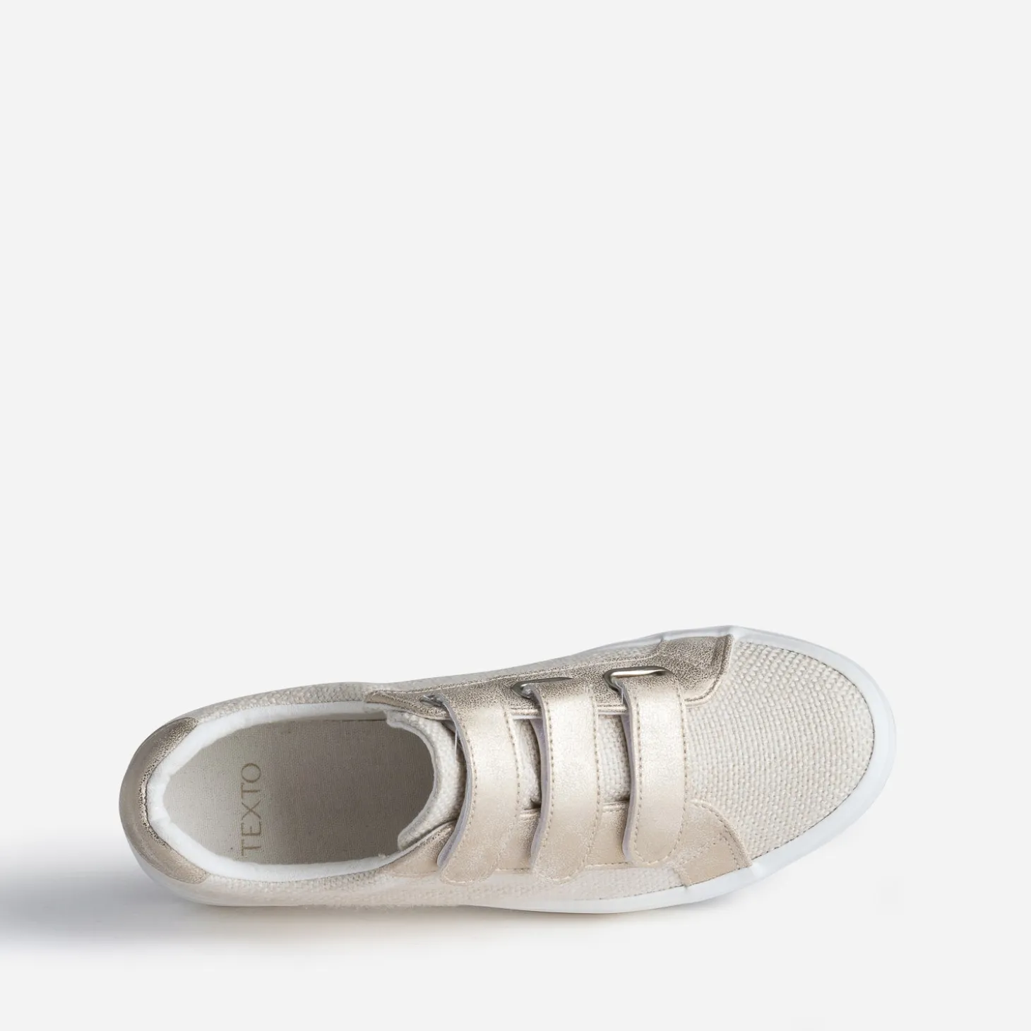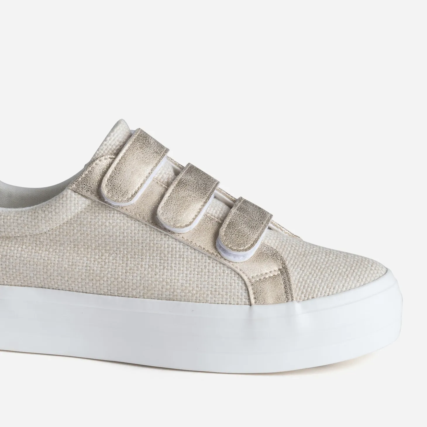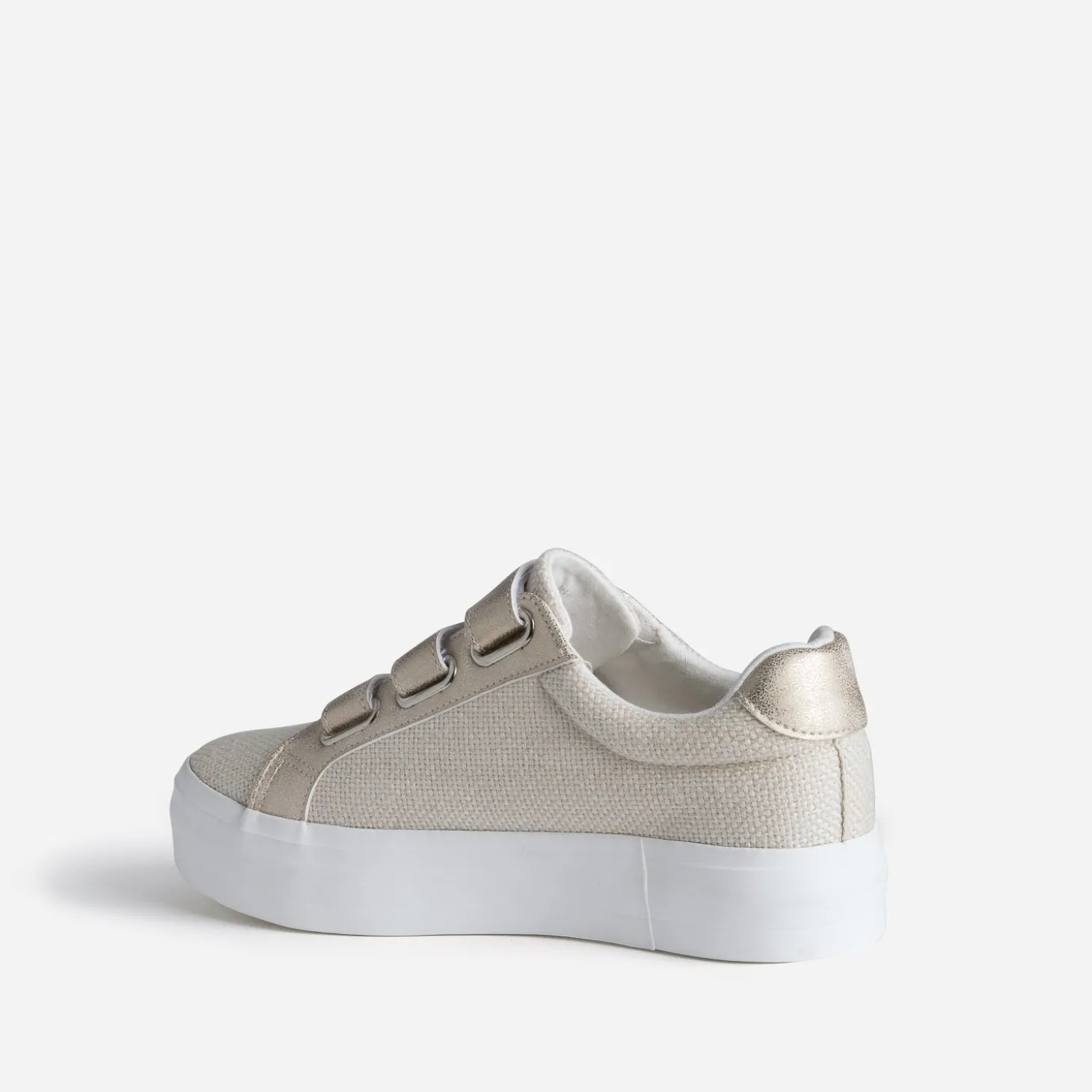 La tennis femme n’en finit pas de se réinventer. Un air de printemps souffle sur ce modèle de couleur beige, en textile tressé, rehaussé de touches dorées effet patiné, sur les trois scratchs et le contrefort. Elle est modernisée par une semelle à plateforme, pour gagner quelques centimètres sans effort. Apportez du chic à vos tenues du quotidien, et du cool aux tenues raffinées.