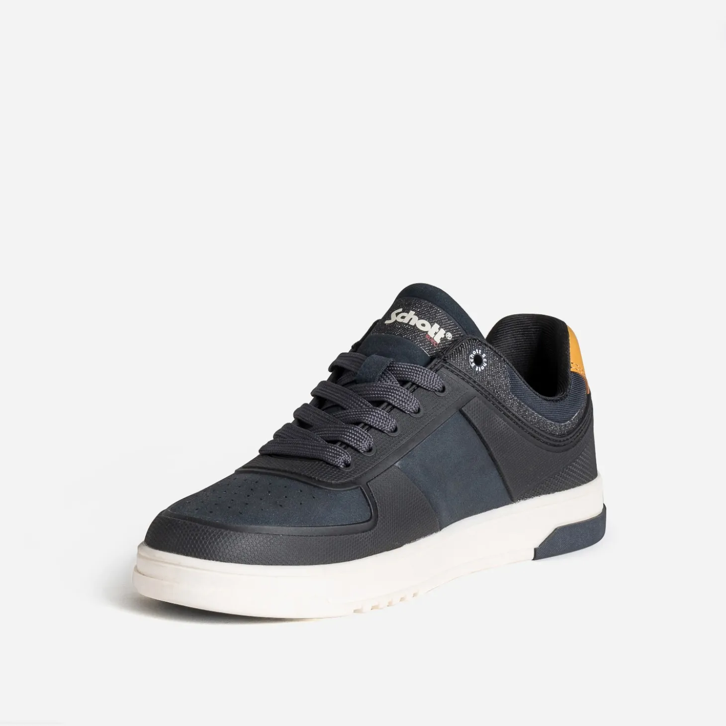 Design moderne validé à 100% pour cette tennis pour homme. En matière synthétique, elle alterne les effets lisses, perforés, embossés, dans un équilibre bien pensé. Bleu marine, elle crée la surprise par une touche jaune ocre sur le contrefort et une semelle intérieure orange. Un modèle idéal pour le quotidien, avec une chemise en jean et un pantalon chino bleu.