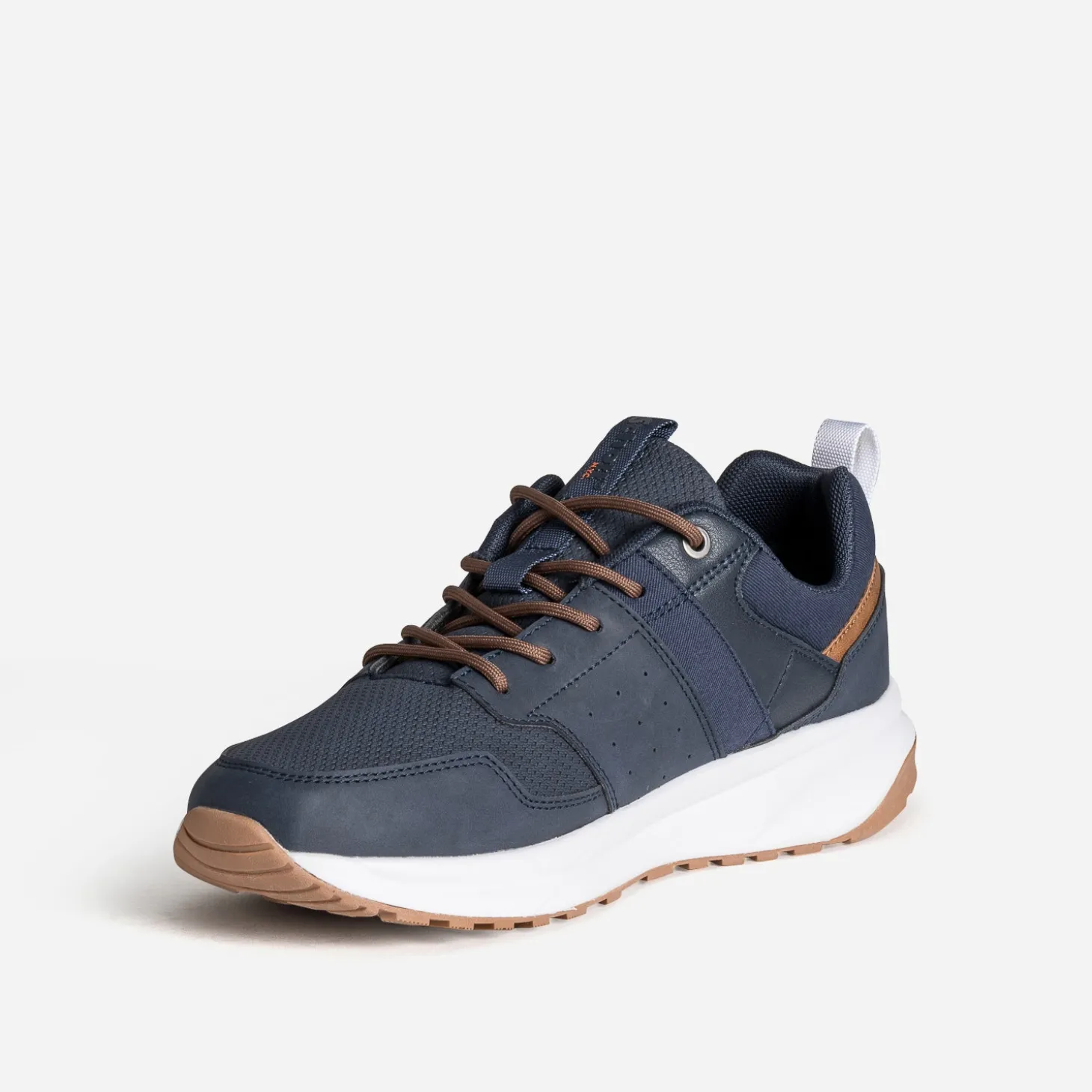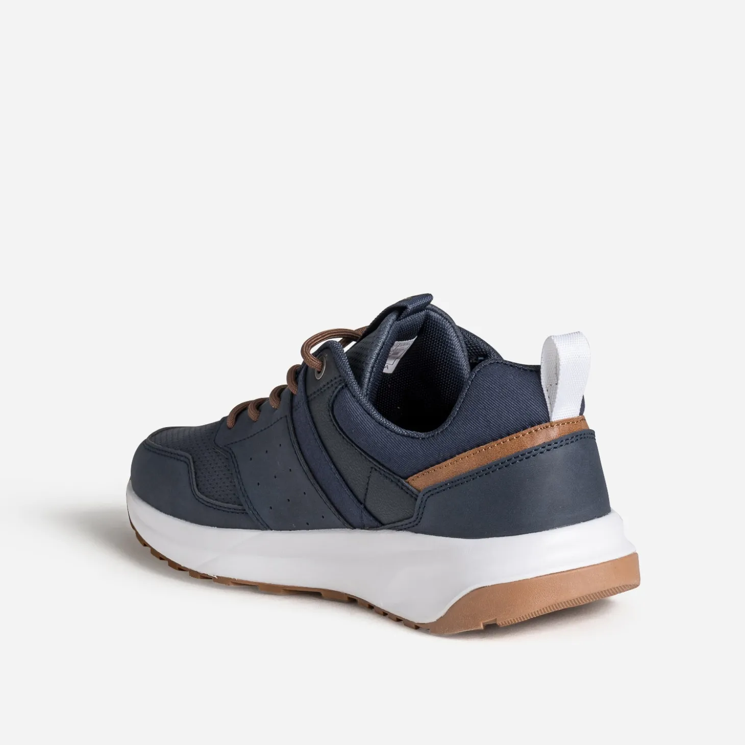 Allure sportive activée avec cette tennis pour homme. Bleu marine et chocolat, la matière synthétique multiplie les jeux de matières lisses ou embossés pour créer du rythme et asseoir son style. Un modèle à réserver avec un nouveau jogging bien coupé et sweat à capuche.