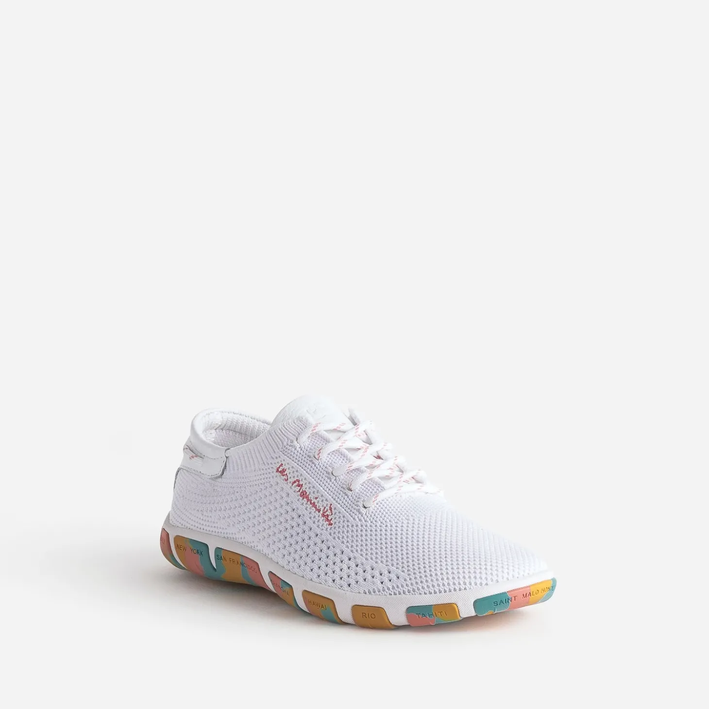 Signé ‘Les Marinières’, cet iconique de la marque, conçu en textile tricoté, inspiré du mesh des équipements de sport et non doublé, est reconnu pour sa légèreté, sa souplesse et sa résistance. Adoptez, sans attendre, cette tennis pour femme en coloris blanc, avec lacet rond délicatement rayé de corail, en écho à la broderie placée sur le côté. La semelle contrastée se démarque par un motif camouflage coloré. New York, Hawaï, Saint Malo ou Hong Kong, voyagez le pied léger !