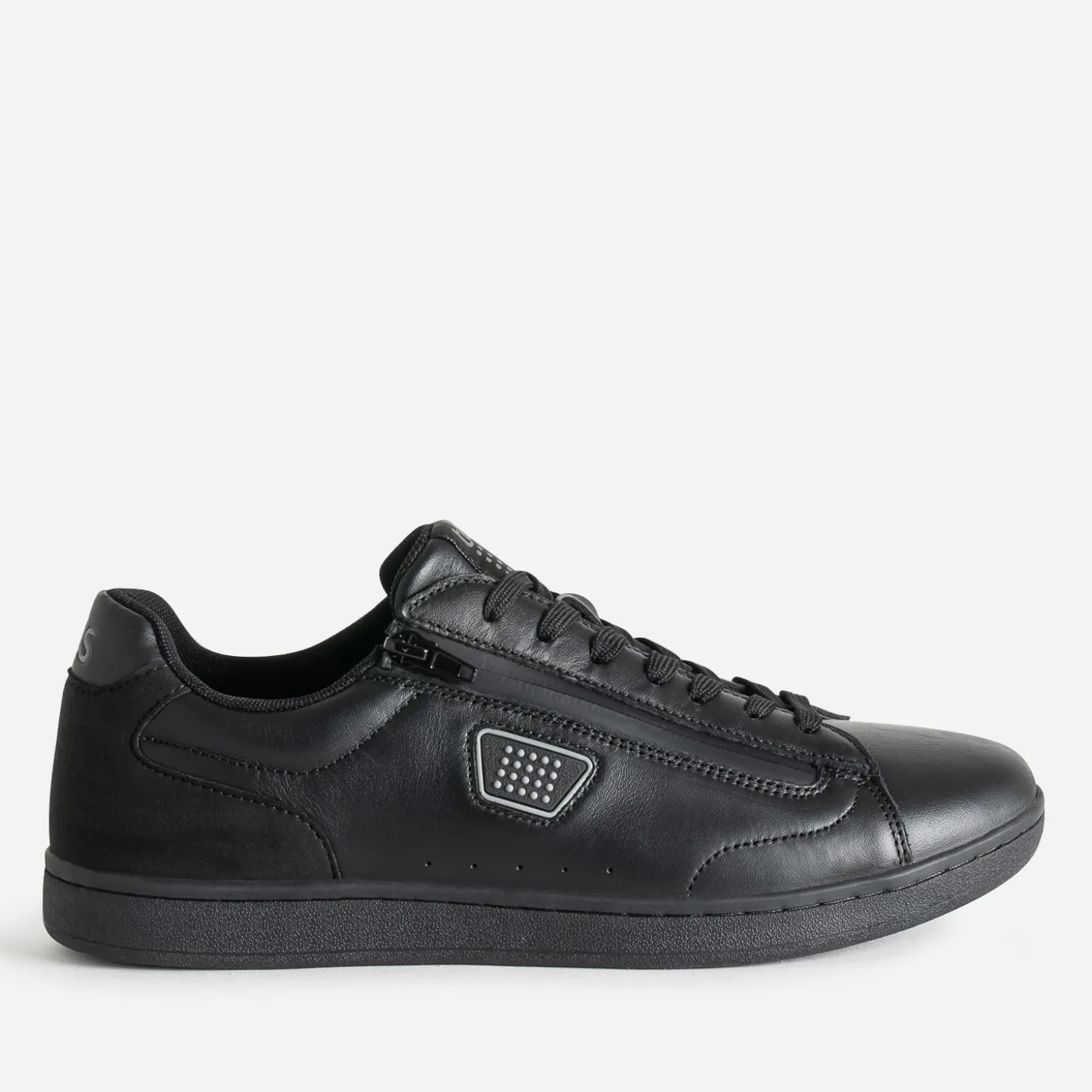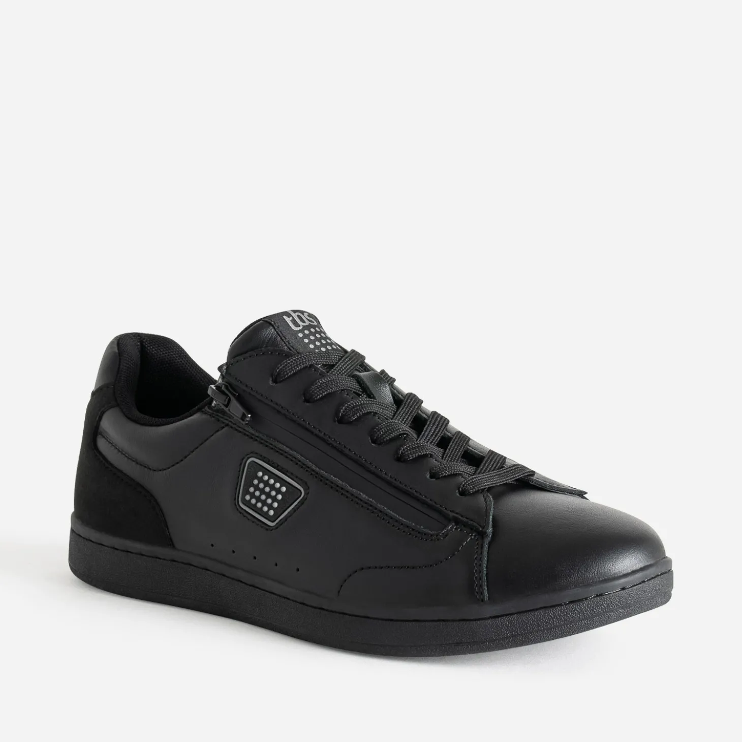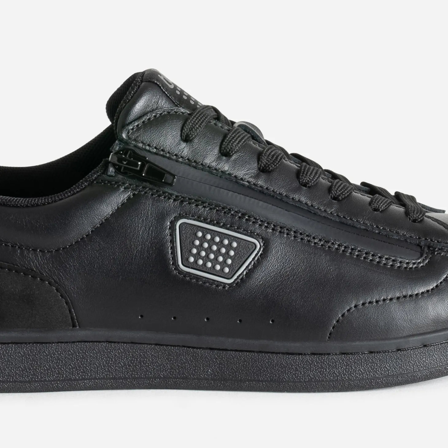 La tennis s’inscrit dans le shoesing quotidien des hommes depuis plusieurs saisons. En cuir noir, elle opte pour une ligne minimaliste, avec fermeture par lacet et zip côté. Elle est soulignée d’un empiècement suédé sur le contrefort, et rythmée de perforations identitaires à 20 points sur le côté. Un modèle à associer avec un total look noir.