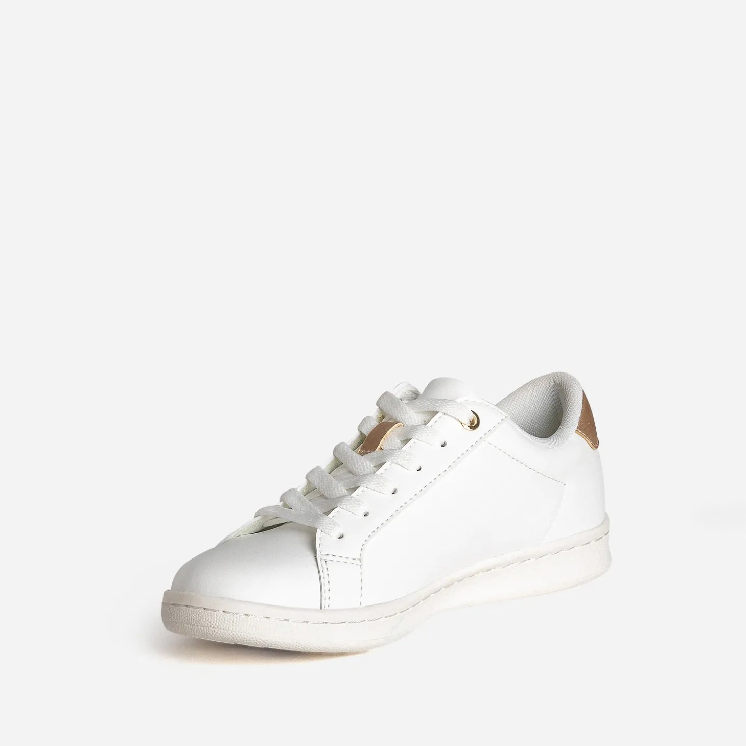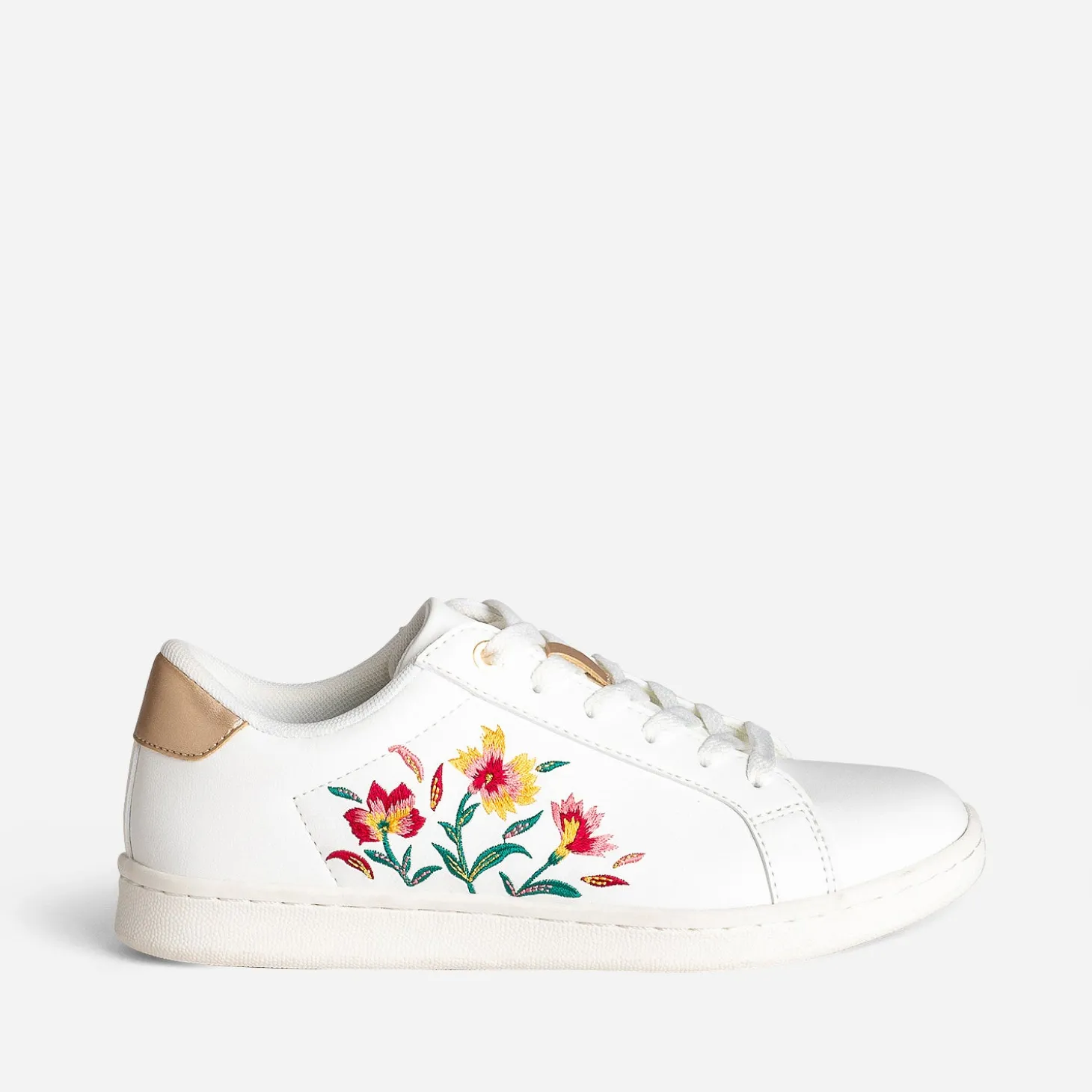 La tennis annonce l’arrivée du printemps. Comment ? Par une broderie fleurs en couleurs, posée sur le côté. En matière synthétique blanche, elle se laisse twister de touches dorées sur la languette et le contrefort. Un modèle à associer à un top jaune safran, sur une jupe midi en lin rose, avec une ceinture rouge.