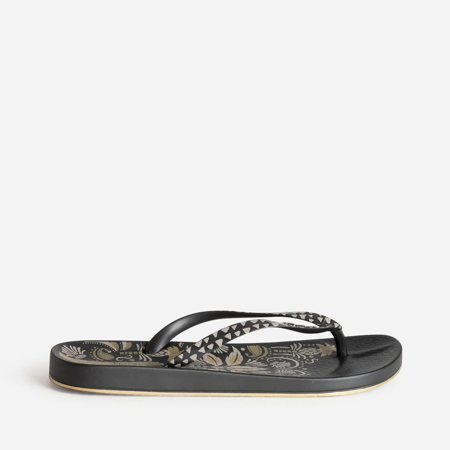 Adepte des tatouages permanents ou éphémères ? Cette tong est faite pour vous ! Bien plus qu’une simple chaussure de plage, elle dévoile une semelle ornée d’un motif floral gris et doré sur fond noir, façon parure tatouée, et des brides graphiques. Un modèle au confort iconique, à accompagnera d’un combishort noir et de bijoux dorés.