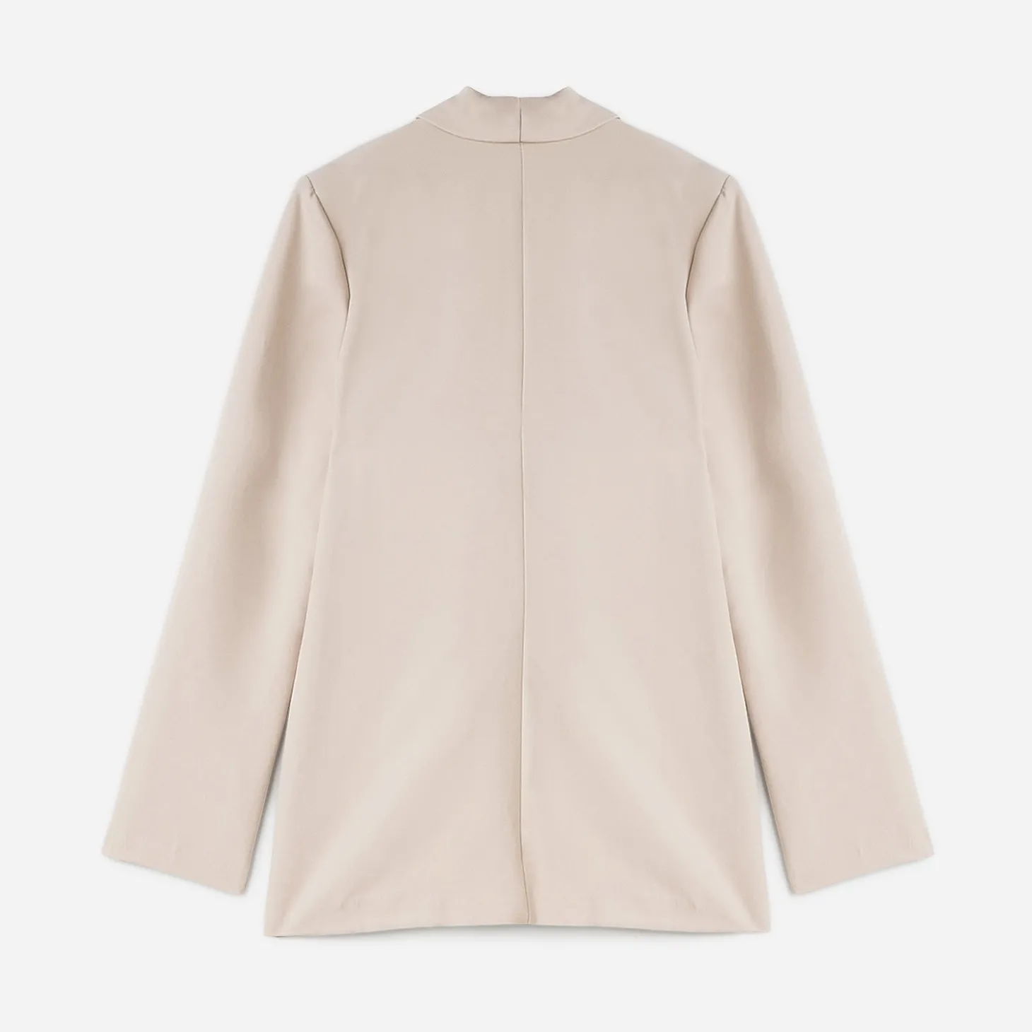 Signature classique chic par excellence, la veste de costume se décline dans un coloris beige, plus estival. Légère, elle se démarque par un col châle, plus moderne. Associez-la avec une blouse marine, un jean cropped brut et une paire de mocassins camel.