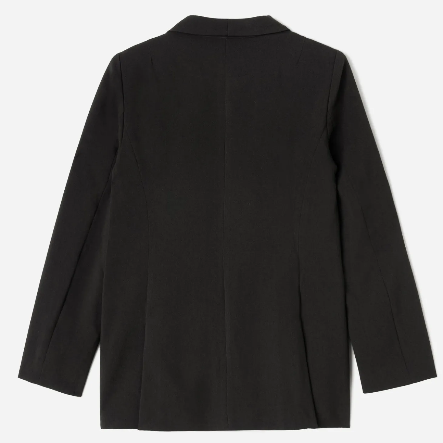Empruntée au vestiaire masculin, la veste de costume noire est devenue une pièce intemporelle. Col châle, poches passepoilées, elle se ferme par un double boutonnage croisé. Idéal sur un pantalon noir, large ou cigarette, décalée avec une paire de baskets.