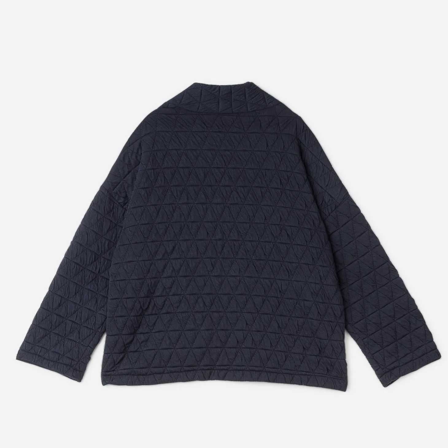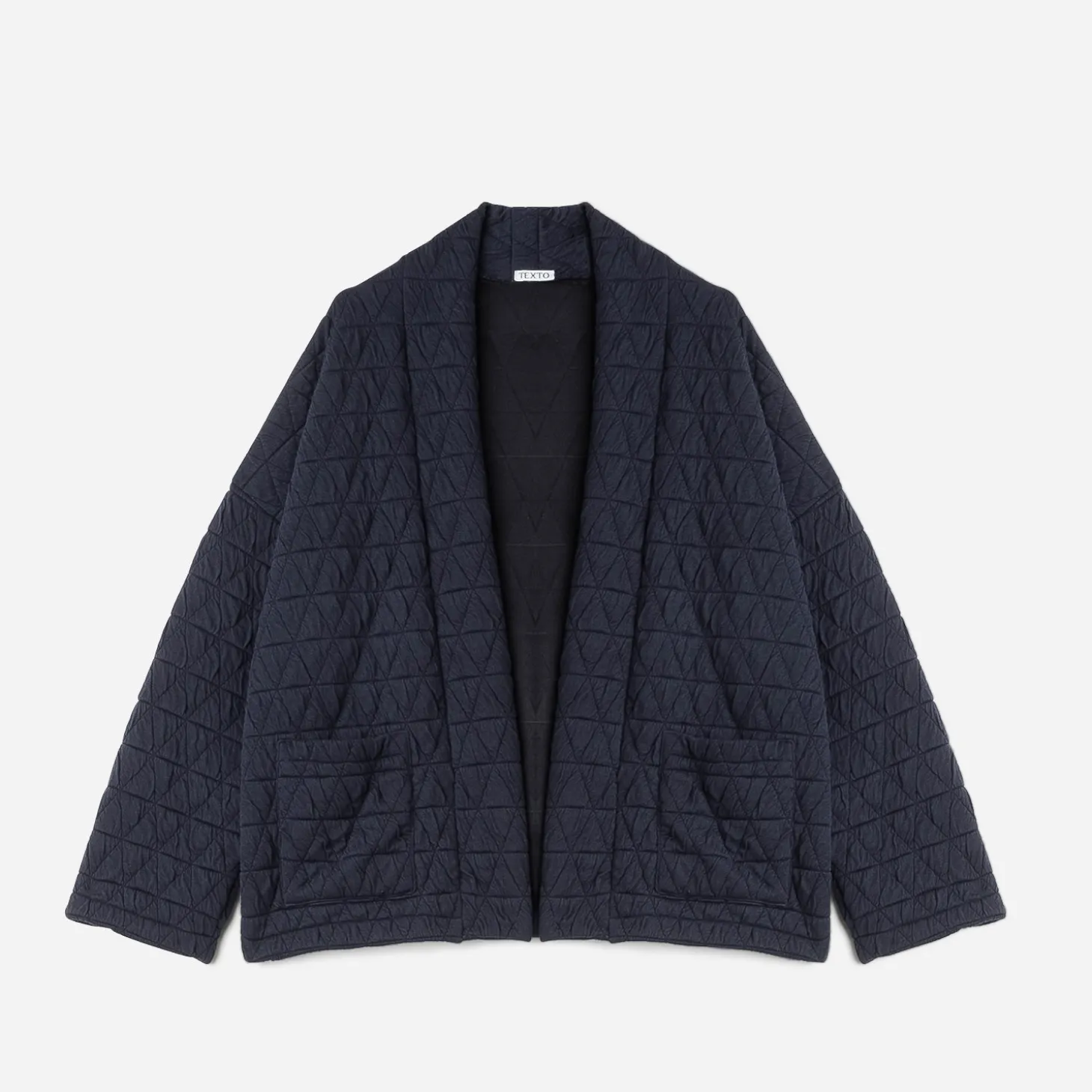 La tendance matelassée confirme son statut mode. Elle investit cette veste bleu marine forme kimono, sans fermeture. Une pièce idéale pour la mi-saison, à superposer sur un débardeur bleu et un jean droit cropped bleu.