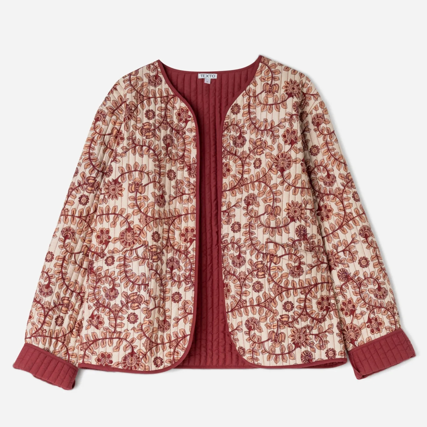 La veste matelassée s’impose comme la tendance phare de la mi-saison : légère, stylée et parfaite pour les températures changeantes. Confectionnée en textile, elle présente un imprimé fleurs indiennes beige sur fond rouge foncé. Préférez-la sur un look monochrome beige, avec des mocassins en cuir camel et le maxi cabas assorti.