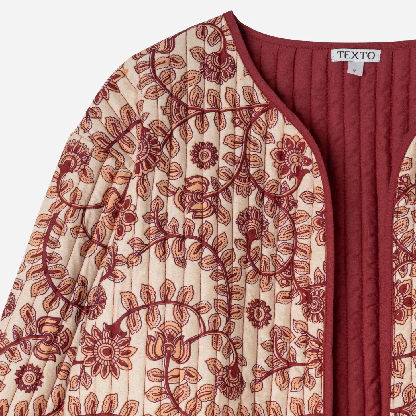 Forme droite, col rond, manches longues, deux poches plaquées devant, imprimé fleurs indiennes, surpiqûres pour effet matelassé, sans fermeture.